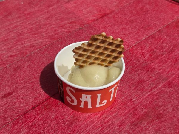 The very first bite opened with notes of cinnamon, occasionally cut with bite-sized slices of apple, and closed with a strong aftertaste of fall spices. Like many Salt & Straw flavors, Apple Cider Donut includes chunks of cake, which gives the smooth ice cream texture contrast and an enjoyable chew. While the flavor is described as apple cider inspired, the ice cream’s cinnamon, nutmeg and cardamom spices as well as streusel topping overpowers notes of apple. It’s a classic fall flavor, though almost no apple comes through — quite difficult to finish if you are not a fan of cinnamon.